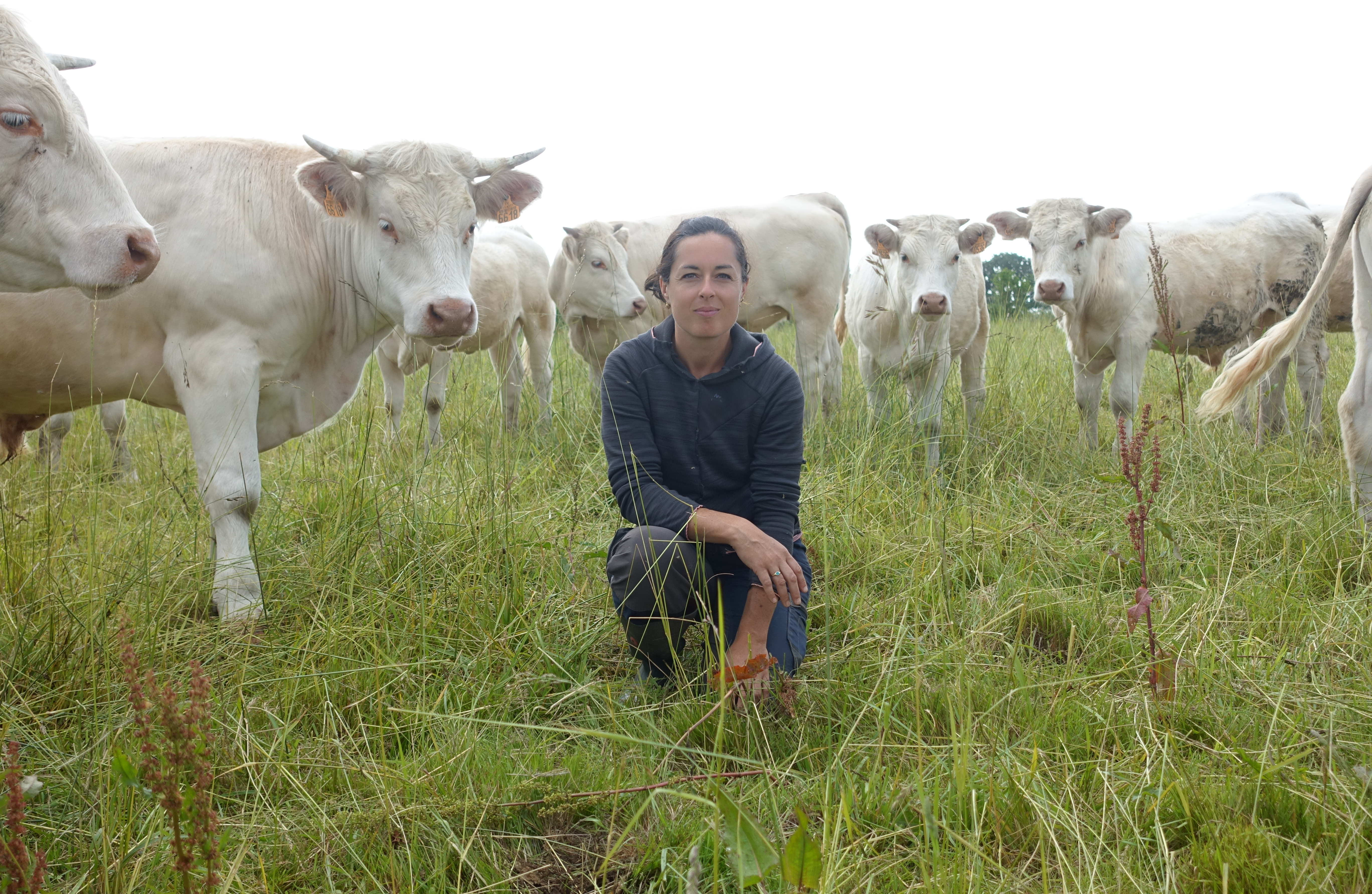 Notre troupeau est constitué de vaches et de génisses de race Charolaise, nées et élevées sur notre ferme. La race charolaise est une race rustique qui correspond tout à fait à notre système (quasi plein air et tout herbe) : elle s'adapte très facilement aux contraintes extérieures et à l'élevage extensif à base de prairies naturelles. Nos vaches sont nourries exclusivement à l'herbe. De Mai à décembre, elles pâturent dans les prés attenant à la ferme et dans les marais du lac de Grand Lieu. De janvier à avril, pendant la période des vêlages, elles sont nourries au foin et à l'enrubannage. Les veaux sont avec leur mère de la naissance (février/mars) jusqu'au sevrage qui a lieu vers le mois de novembre, lorsque l'herbe se fait plus rare. Au sevrage, les veaux sont regroupés et mis à l'abri sous la stabulation. Un fourrage de qualité (enrubannage) leur est fourni afin de répondre à leur besoin important de croissance.